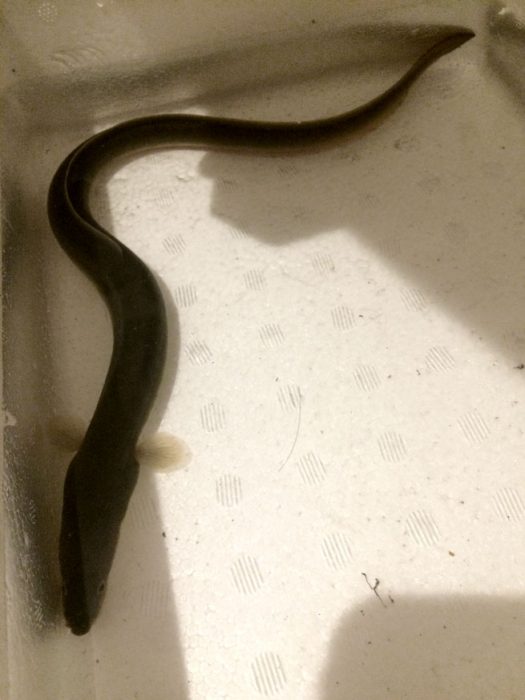 まごうことなきウナギです。本当にウナギが釣れてしまいました。こんな近所にもいるものですね。