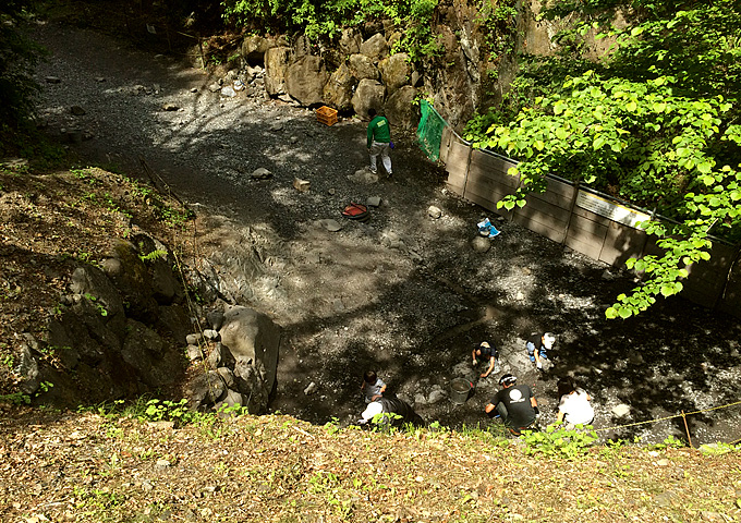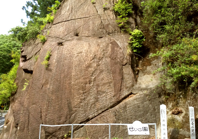 そして、武器を託されたのち、係の人に地層まで案内してもらい、そのまま5分程度の説明を受ける。係の人によるレクチャーによると、ここの地層は、埼玉県西部から群馬県南部を通り長野県東部までつながった山中地溝帯というものの一部で、「瀬林層」という、約1億3000万年前の白亜紀前期のものらしい。