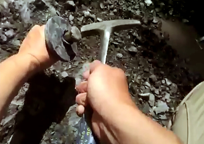 ちなみに、実際に後で借りて知ったのだが、現地にはタガネを入れたバケツが置いてあり、必要な場合は勝手に貸りて岩や地層をベキベキとはがしても良いとのこと。ザ・発掘っぽさ満点!